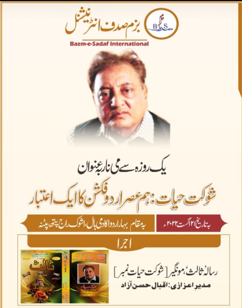 پٹنہ:12؍اگست:ہم عصر اردو افسانے کی صفِ اوّل میں امتیاز کے ساتھ جن افسانہ نگاروں کا نام لیا جاتا ہے ،ان میں شوکت حیات پوری اردو آبادی کی نمایندگی کرتے ہیں۔ گنبد کے کبوتر ،بانگ،رانی باغ، ڈھلان پر رُکے ہوئے قدم، گھونسلا اور رحمت صاحب جیسے یادگار افسانوں کے خالق گذشتہ برس وبائی دَور کے سخت حملوں کے بیچ کچھ ایسی خاموشی سے رُخصت ہوئے کہ ان کے چاہنے والے نہ ٹھیک سے تعزیت کر سکے اور نہ ہی اہالیانِ عظیم آباد اُن کی خدمات کا اعتراف کر سکے۔ ممتاز ادبی رسالہ ’ثالث‘ ، مونگیر کے مدیرِ اعزازی ڈاکٹر اقبال حسن آزاد کے دل میں یہ خیال آیا کہ اُن کی خدمات کا بھرپور طریقے سے اعتراف کیا جائے۔ رسالہ ’ثالث‘ نے 496 صفحات پر مشتمل خصوصی نمبر شایع کر دیا ہے۔ اس کا اجرا بزمِ صدف انٹرنیشنل کے سے می نار بہ عنوان ”شوکت حیات: ہم عصر اردو فکش کا ایک اعتبار“ مورخہ١ ۲ اگست ۲۲۰۲ء بہ وقت دس بجے دن بہار اردو اکادمی ، پٹنہ کے ہال میں ہوگا۔