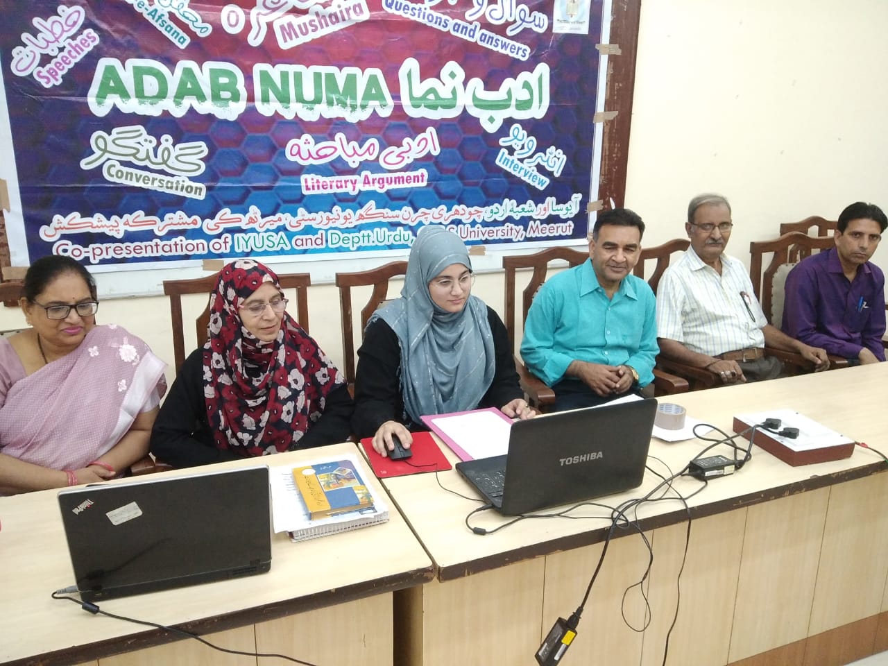 اس سے قبل پرو گرام کا آغاز عظمیٰ پروین نے تلا وت کلام پاک سے کیا۔بعد ازاں علماملک نے ہدیہ نعت پیش کیا۔اس ادب نما پروگرام کی سرپرستی معروف ناقد و افسانہ نگار اور صدر شعبۂ اردو پروفیسر اسلم جمشید پوری اور صدارت کے فرائض معروف ادیب عارف نقوی ، جرمنی نے انجام دیے ۔ استقبالیہ کلمات ڈاکٹر شاداب علیم، مہمان خصوصی کا تعارف ڈاکٹر ارشاد سیانوی،نظامت سیدہ مریم الٰہی اور شکریے کی رسم ڈاکٹر الکا وششٹھ نے انجام دی۔