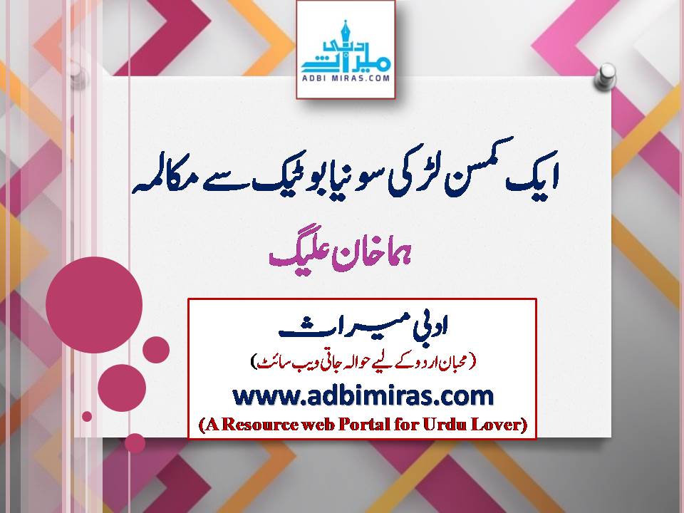 آج کے دور میں ہر لڑکی کو یہ کہانی پڑھنا چاہۓ ۔ اور ایک خوف کا بھوت جو لڑکیوں کے اندر بیٹھا ہوتا ہے۔ ان کے اندر ہمت کا مادہ نہیں ہوتا ۔۔۔کسی بھی مصیبت کا سامنا نہیں کر سکتی ۔۔۔ اپنے حق کے لۓ آواز نہیں اٹھا سکتی۔۔ انہیں سونیا کی طرح بننے کے کوشش کرنی چاہے ۔۔۔ ہر کسی کے اندر ایک سونیا موجود ہے ۔۔۔۔ کہانی چاہے کچھ بھی ہوں۔۔۔ لیکن ہمیں ایسی ہی بہادری اور ہمت کے ساتھ مقابلہ کرنا چاہۓ ۔۔۔جس طرح سونیا نے کیا ۔۔۔۔ایک بوٹیک کھولا ہر فیصلے کے خلاف گئ ۔۔بچپن کے لگے رشتے سے بھی انکار کر دیا ۔۔۔۔۔۔۔یہی ہمت یہی بہادرہ ہر لڑکی میں ہونی چاہۓ ۔۔ اس افسانے کا یک اقتباس ملاحظہ ہوں جو مجھے بے حد پسند آیا ۔۔۔ (یہ بھی پڑھیں عصمت چغتائی: کھلے پنکھ والی افسانہ نگار – ڈاکٹرپرویز شہریار )