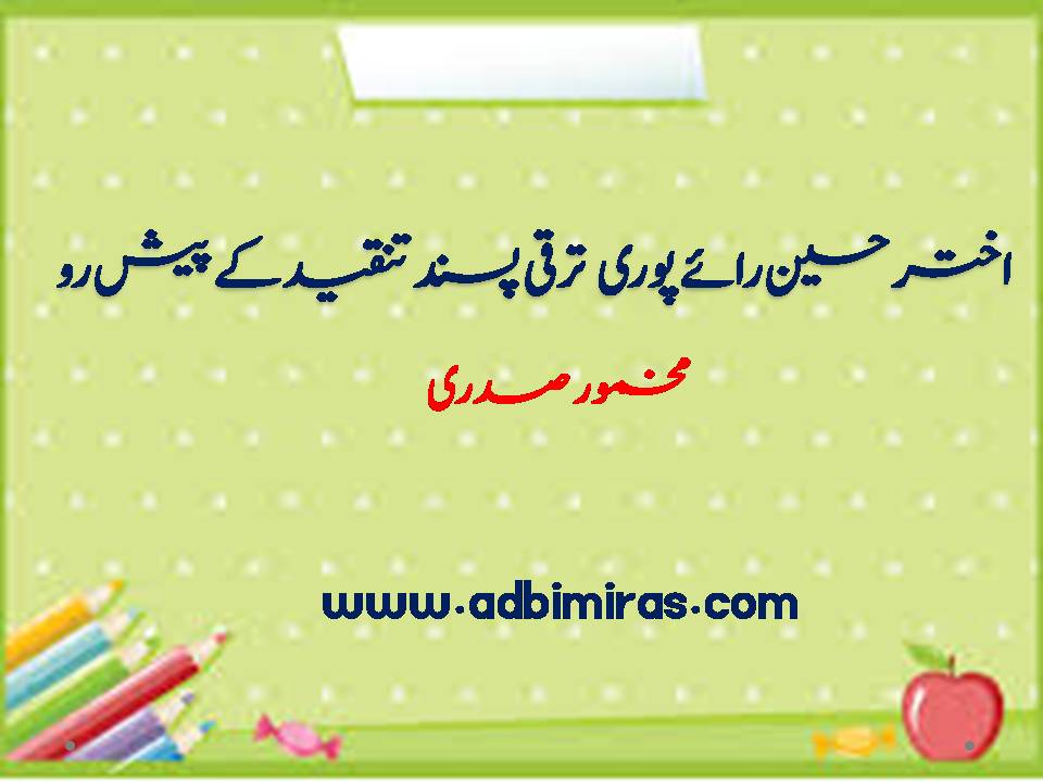 مجنوں گورکھپوری کامضمون ’ادب اورزندگی‘ 1938 کی تحریر ہے۔ اس لحاظ سے ادب اورزندگی کے موضوع پر اور ترقی پسندی کے باب میں اختر حسین رائے پوری کی حیثیت پیش روکی ہے۔ان کا اولین مقالہ ’ادب اور زندگی‘ ترقی پسندتنقیدکانقطہ آغازہے۔ سجادظہیرنے بھی اس بات کوتسلیم کیاہے کہ ’’1936 یا اس سے کچھ پہلے اختر حسین رائے پوری نے اپنا مشہور مضمون ’ادب اور زندگی‘ لکھا، جو انجمن ترقی اردو (ہند) کے سہ ماہی رسالے ’اردو‘ میں شائع ہوا۔ میرے خیال میں یہ ہماری زبان میں پہلا مضمون ہے جس میں مبسوط اور مدلل طریقے سے نئے ترقی پسند ادب کی تخلیق کی ضرورت بتائی گئی ہے۔ اس اہم مضمون کے مصنف کی حیثیت سے اختر حسین رائے پوری کو اردو کے ترقی پسند ادب کی تحریک کے بانیوں میں اولیت حاصل ہے۔‘‘7