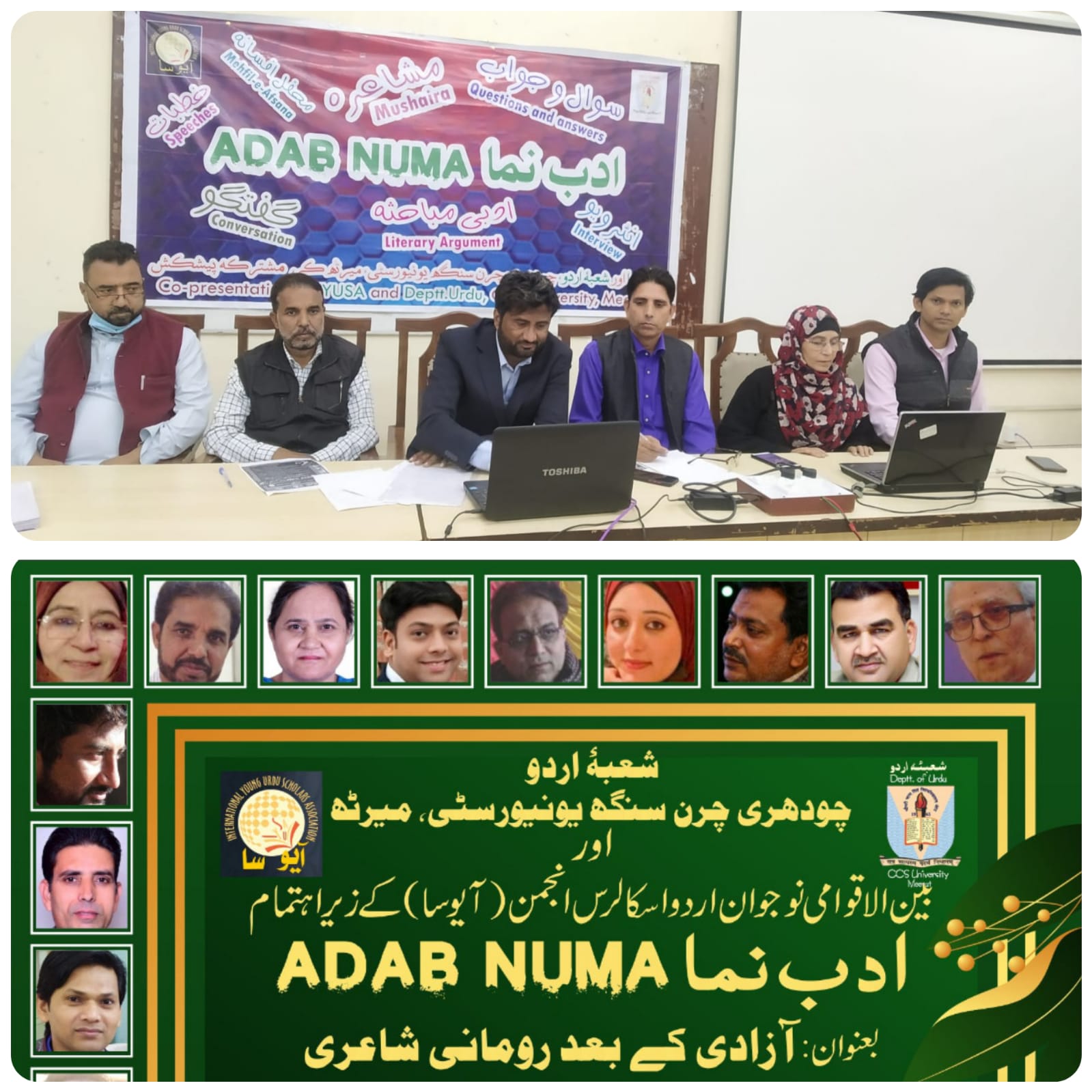 اس سے قبل پرو گرام کا آغاز سعید احمد سہارنپوری نے تلاوت کلام پاک سے کیا۔اس ادب نما پروگرام کی سر پرستی معروف ادیب عارف نقوی ، جرمنی اور صدر شعبۂ اردو،چودھری چرن سنگھ یونیورسٹی،میرٹھ پروفیسر اسلم جمشید پوری نے فرمائی ۔مہمان خصوصی کے بطور ایسو سی ایٹ پروفیسر عین شمس یونیورسٹی،مصر سے ڈاکٹر ولا جمال العسیلی نے آن لائن شرکت کی۔مقالہ نگاران کے بطور مولانا آزاد نیشنل اردو یونیورسٹی ،حیدر آباد سے ڈاکٹر کہکشاں لطیف،ذاکر حسین کالج،دہلی سے ڈاکٹر ظہیر رحمتی اور انصار انٹر کالج،مراد آباد سے ڈاکٹر ناصر پرویزنے اپنے پر مغز مقالات پیش کیے۔استقبالیہ کلمات ڈاکٹر ارشاد سیانوی ،نظامت کے فرائض تابش فرید اور شکریے کی رسم ڈاکٹر آصف علی نے ادا کی۔