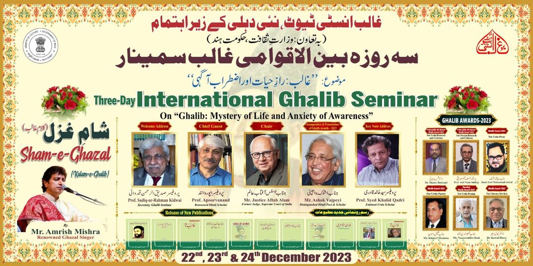 غالب انسٹی ٹیوٹ ہر سال غالب کے یوم ولادت کی مناسبت سے بین الاقوامی غالب تقریبات کا اہتمام کرتا ہے جس کے تحت عالمی سمینار، شام غزل، عالمی مشاعرہ اور اردو ڈرامے کا اہتمام کیا جاتا ہے۔ اس مرتبہ یہ تقریبات 22 تا 24 دسمبر ایوان غالب نئی دہلی میں ہوں گی۔ غالب انسٹی ٹیوٹ کے سکریٹری پروفیسر صدیق الرحمٰن قدوائی نے نامہ نگاروں کو بتایا کہ اس مرتبہ سمینار کا موضوع ’غالب: راز حیات اور اضطراب آگہی‘ ہے۔ سمینار کا کلیدی خطبہ پروفیسر سید خالد قادری پیش کریں گے۔ افتتاحی اجلاس کی صدارت جناب جسٹس آفتاب عالم صاحب فرمائیں گے۔ سمینار کا افتتاح جناب اشوک واجپئی صاحب کریں گے اور پروفیسر اپوروانند صاحب مہمان خصوصی کی حیثیت سے افتتاحی اجلاس میں شریک ہوں گے۔ پروفیسر صدیق الرحمٰن قدوائی صاحب استقبالیہ کلمات اور ڈاکٹر ادریس احمد صاحب اظہار تشکر فرمائیں گے۔اس موقع ڈاکٹر شمس بدایونی کو برائے اردو تحقیق و تنقید، پروفیسر آصف نعیم کو برائے فارسی تحقیق و تنقید، جناب سید محمد اشرف کو برائے اردو نثر، جناب خلیل مامون کو برائے اردو شاعری، جناب نصیرالدین شاہ کو برائے اردو ڈرامہ، اور ڈاکٹر کیول دھیر کو برائے مجموعی ادبی خدمات غالب انعام 2023 پیش کیا جائے گا۔ افتتاحی اجلاس کے بعد شام غزل (کلام غالب) کا اہتمام کیا جائے گا جس میں معروف غزل سنگر جناب امریش مشرا غزل سرائی کریں گے۔ 23 اور 24 / دسمبر کو صبح 10 بجے سے شام 5 بجے تک ادبی اجلاس ہوں گے جس میں ملک و بیرون ملک کے دانشور مقالات پیش کریں گے۔ سمینار میں جن حضرات کو مقالہ خوانی کے لیے مدعو کیا گیا ہے ان کے نام اس طرح ہیں: ڈاکٹر سید تقی عابدی(کناڈا)،جناب انتخاب حمید،جناب امیر مہدی (لندن)،ڈاکٹر آصف علی عادل علی محمد،ڈاکٹر تاشیانہ علی محمد(ماریشس)،پروفیسرمحمد غلام ربانی، پروفیسر رشید احمد، ڈاکٹر محمدشمیع الاسلام (بنگلہ دیش)، پروفیسر رضا محمد نصیری،پروفیسر رضا علی حبیبی، پروفیسر محمد شالوی(ایران)، پروفیسر عتیق اللہ، پروفیسر عبدالحق، پروفیسر شریف حسین قاسمی،پروفیسر آذر می دُخت صفوی،پروفیسر قاضی جمال حسین، پروفیسر انیس اشفاق،پروفیسر وہاج الدین علوی،ڈاکٹر نریش، ڈاکٹر خالد علوی، پروفیسر فاروق بخشی، پروفیسر شہاب الدین ثاقب، پروفیسر سید حسن عباس،پروفیسر نسیم الدین فریس،پروفیسر خواجہ محمد اکرام الدین،پروفیسر اسلم جمشید پوری، پروفیسر ابوبکر عباد، ڈاکٹر معراج رعنا، ڈاکٹر امتیازاحمد،ڈاکٹر کفیل احمدنسیم،ڈاکٹر ریحان حسن،ڈاکٹر محمدشاہد پٹھان،ڈاکٹر عمیر منظر، ڈاکٹر معید الرحمن،ڈاکٹر الطاف انجم، ڈاکٹر نصرت جبین، ڈاکٹر محمد اکمل، ڈاکٹر سید ثاقب فریدی۔ اجلاس کے صدور: پروفیسرقاضی جمال حسین،پروفیسرانیس اشفاق،پروفیسر چندر شیکھر، ڈاکٹر سید تقی عابدی،پروفیسر ضیاء الرحمن صدیقی،جناب انتخاب حمید، پروفیسر ارتضیٰ کریم، پروفیسر انور پاشا، ڈاکٹر محمد کاظم اور ناظم اجلاس: ڈاکٹر شعیب رضا خان وارثی، ڈاکٹرخالد مبشر،ڈاکٹر شاداب تبسم، ڈاکٹر ابراہیم افسر،ڈاکٹر نوشاد منظر، ڈاکٹر شاہد اقبال، ڈاکٹر امیر حمزہ اور محترمہ سیمیں فلک ہوں گی۔ 23/ دسمبر کو شام 6 بجے عالمی مشاعرے کا اہتمام کیا جائے گا جس کی صدارت ڈاکٹر سید تقی عابدی صاحب فرمائیں گے اور مہمانِ خصوصی جناب امیرمہدی ہوں گے۔ نظامت کے فرائض جناب منصور عثمانی اور جناب معین شاداب ادا کریں گے۔ جن شعرا کو دعوت نامے بھیجے گئے ہیں ان کے نام اس طرح ہیں: جناب جلیل نظامی(قطر)،پروفیسر وسیم بریلوی،جناب اظہر عنایتی، ڈاکٹر نواز دیوبندی، جناب شین کاف نظام، جناب منصور عثمانی، جناب متین امروہوی،جناب اعجاز پاپولر، جناب فاروق جائسی، پروفیسر ناشر نقوی،جناب خورشید حیدر،جناب افضل منگلوری،جناب آشو مشرا،جناب حسن فتح پوری، پروفیسر فاروق بخشی، جناب راشد جمال فاروقی،جناب منیر ہمدم،جناب ماجد دیوبندی،جناب سلیم امروہوی،جناب اقبال اشہر، جناب ذکی طارق،جناب شکیل جمالی،جناب معین شاداب، ڈاکٹر وسیم راشد، محترمہ آشکارا خانم ’کشف‘۔ 24 / دسمبر کو شام 6بجے’ہم سب ڈ