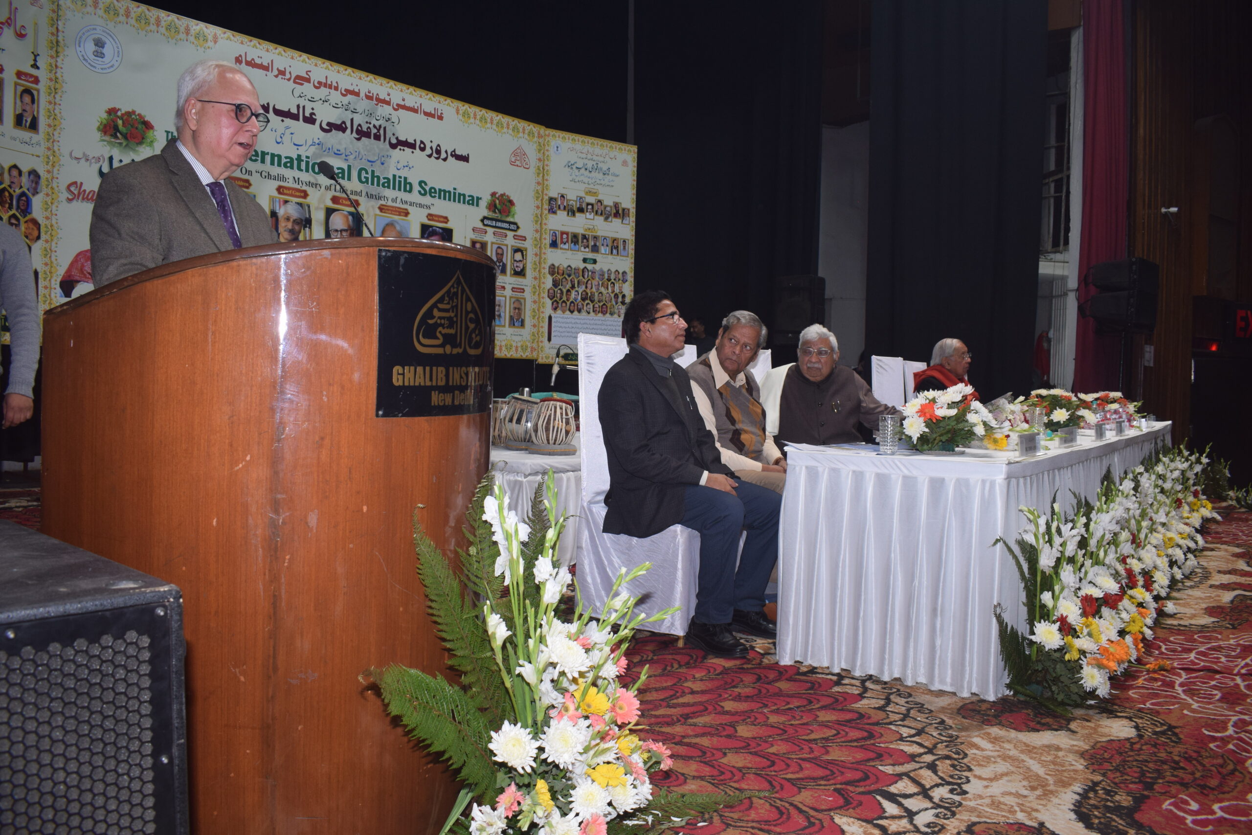 غالب انسٹی ٹیوٹ کے زیر اہتمام سہ روزہ بین الاقوامی غالب تقریبات کا افتتاح جمعے کے روز ایوان غالب میں عمل میں آیا۔ اجلاس کاافتتاح کرتے ہوئے معروف ہندی دانشور جناب اشوک واجپئی نے کہا کہ غالب تقریبات کے تحت ہونے والی سرگرمیاں ہماری علمی اور ثقافتی وابستگی کو واضح کرتی ہیں۔ سمینار کا موضوع ’غالب: راز حیات اور اضطراب آگہی‘ غور و فکر کے بہت سے زاویے اپنے اندر لیے ہوئے ہے۔ غالب نے راز حیات کو سمجھنے کے بعد جس اضطراب کو محسوس کیا اسی نے ان کی تخلیقی صلاحیت کو جلا بخشی ہے۔ پروفیسر سید خالد قادری نے سمینار کا کلیدی خطبہ پیش کرتے ہوئے کہا کہ غالب کے یہاں اضطراب مختلف انداز میں ظاہر ہوا ہے۔ وہ اپنے اضطراب کو ذات تک محدود نہیں رکھتے بلکہ اسے کائنات کی تفہیم کا ذریعہ بنا لیتے ہیں۔ جناب جسٹس آفتاب عالم نے صدارتی تقریر کے دوران کہا کہ انسان کی تمناوں کا ،خوابوں کا اور اُس کے عزم کا جس قدر خوبصورت اور پراعتماد بیان غالب کے یہاں ہے میرے محدود مطالعے میں کہیں نظر سے نہیں گزرا۔ غالب انسٹی ٹیوٹ نے اس موضوع کا انتخاب کر کے اہل قلم کو ایک اہم سمت کی طرف متوجہ کیا ہے۔ غالب انسٹی ٹیوٹ کے سکریٹری پروفیسر صدیق الرحمٰن قدوائی نے مہمانوں کا استقبال کرتے ہوئے کہا کہ غالب انسٹی ٹیوٹ کا یہ سمینار یہاں کی سب سے اہم سرگرمیوں میں شمار ہوتا ہے لہٰذا ہماری کوشش رہتی ہے کہ سمیناروں کے موضوعات میں یکسانیت سے بچا جائے۔ مجھے امید ہے کہ اس موضوع کے تحت جو بھی اجلاس ہوں گے اس میں کارآمد باتیں سامنے آئیں گی۔ غالب انسٹی ٹیوٹ کے ڈائرکٹر ڈاکٹر ادریس احمد نے کہا غالب انسٹی ٹیوٹ ہر برس غالب کے یوم پیدائش کے موقع پر دسمبر میں غالب تقریبات کا اہتمام کرتا ہے اور یہ تقریبات محض رسمی نہیں ہوتیں بلکہ ہم نے پورے سال کیا کیا اس کی ایک رپورٹ بھی ہوتی ہے یہ رپورٹ کتابوں کی رونمائی کی شکل میں پیش کی جاتی ہے۔ مجھے یقین ہے کہ اس سال کا سمینار بھی بہت کامیاب رہے گا اور جب یہ کتابی شکل میں شائع ہوگا تو اس سے گفتگو آگے بڑھے گی۔ اس موقع جناب اشوک واجپئی صاحب کے ہاتھوں سے ڈاکٹر شمس بدایونی کو برائے اردو تحقیق و تنقید، پروفیسر آصف نعیم کو برائے فارسی تحقیق و تنقید، جناب سید محمد اشرف کو برائے اردو نثر، جناب خلیل مامون کو برائے اردو شاعری، جناب نصیرالدین شاہ کو برائے اردو ڈرامہ، اور ڈاکٹر کیول دھیر کو برائے مجموعی ادبی خدمات غالب انعام 2023 پیش کیا گیا۔ کتابوں اور انعام یافتگان کا تعارف ڈاکٹر شگفتہ یاسمین نے پیش کیا۔ افتتاحی اجلاس کے بعد شام غزل (کلام غالب) کا اہتمام کیا گیا جس میں معروف غزل سنگر جناب امریش مشرا نے اپنے مخصوص انداز میں غزل سرائی کی۔ سمینار کے ادبی اجلاس 23 اور 24 دسمبر کو صبح 10 بجے سے شام 5 بجے تک ہوں گے۔ 23 دسمبر کو سمینار کے بعد عالمی مشاعرے کا اہتمام ہوگا جس میں ملک و بیرون ملک کے ممتاز شعرا اپنا کلام پیش کریں گے۔