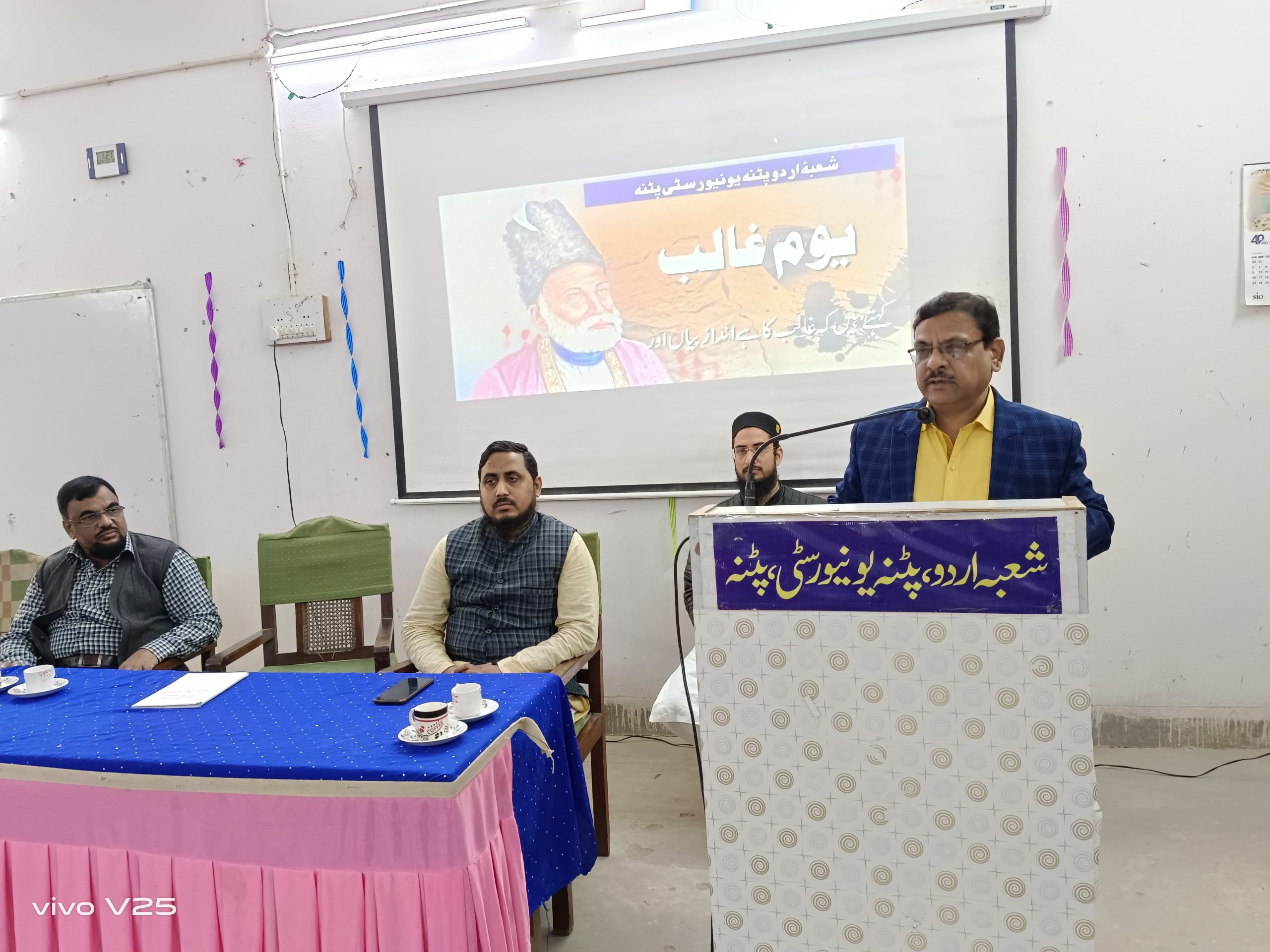 پٹنہ (پریس ریلیز) غالب اردو شاعری کی آبرو ہیں، ان کے بغیر اردو شاعری کا تصور نہیں کیا جاسکتا۔ ان کی شاعری زبان، مذہب، قوم، ملک اور فکر ونظر کی تمام سرحدوں کو توڑتی ہوئی آفاقی ہوجاتی ہے۔ اردو میں غالب سے زیادہ مقبول، پڑھا جانے والا اور بڑا شاعر کوئی نہیں ہوا۔ ان خیالات کا اظہار شعبۂ اردو پٹنہ یونیورسٹی میں منعقدہ یوم غالب تقریب میں صدر شعبۂ اردو ڈاکٹر شہاب ظفر اعظمی نے کیا۔ انہوں نے طلبہ سے غالب کو زیادہ سے زیادہ پڑھنے کی تلقین کرتے ہوئے کہا کہ اگر آپ غالب کو اچھی طرح پڑھنے اور سمجھنے کے اہل ہوجاتے ہیں تو دوسرے تمام شعرا آپ کے لیے آسان ہوجائیں گے۔ غالب کے یہاں معنی اور اسلوب دونوں اعتبار سے تنوع، گہرائی اور وسعت ملتی ہے۔ صدر شعبۂ عربی ڈاکٹر سرور عالم نے غالب کی شاعری میں مذہبی وصوفیانہ شاعری کے پہلو پر روشنی ڈالتے ہوئے کہا کہ بے ثباتی عالم کو پیش کرنے کے لیے ’’بازیچہ اطفال ہے دنیا میرے آگے‘‘ سے اچھا شعر نہیں پیش کیا جاسکتا۔ جناب شاہد وصی نے کہا کہ غالب سب کے دلوں کے ترجمان ہیں۔ ان کی شاعری سے ہر شخص اپنی فکر اور صلاحیت کے مطابق معنی ومفہوم اخذ کرسکتا ہے۔ ان کی شاعری معنی کے اعتبار سے مشکل ضرور ہے مگر سمجھ میں آجائے تو نئے جہان سے بھی آشنا کراتی ہے۔