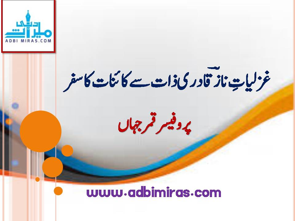 نازؔ قادری کی غزلیات پر لکھنے کے لیے جب میں نے قلم اٹھا لیا ہے تو دیر سے سوچ رہی ہوں کہ کیا لکھوں؟ جب پروفیسر وہاب اشرفی اور پروفیسر لطف الرحمن جیسے جید عالم ونقاد نے نازؔ قادری کے کلام پر اپنی پسندیدگی کی مُہر ثبت کردی ہے تو ایسے میں مجھ ناچیز کی کیا بساط؟ مگر وہ جو برابر سنتے آئے ہیں کہ اچھی شاعری پڑھنے کے بعد خود قاری پر بھی کچھ ایسی کیفیت طاری ہوجاتی ہے کہ وہ چاہتے اور نہ چاہتے ہوئے بھی قلم ہاتھ میں اٹھا ہی لیتا ہے یا پھر کچھ گنگنانے لگتا ہے، اندر کی یہ تحریک بڑی چیز ہے، تو میں بھی اب اسی قطار میں ہوں ع