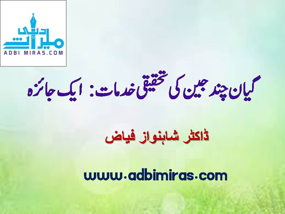 اردو کلاسیکی تحقیق کی اس روایت کو جو حافظ محمود شیرانی ، امیتاز علی خاں عرشی ، قاضی عبدالودود، مالک رام اور رشید حسن خاں سے وابستہ تھی گیان چند جین نے اسے آگے بڑھایا۔ یہ بات قابل غور ہے کہ انہوں نے اپنے آپ کو صرف تحقیق ہی تک محدود نہیں رکھا بلکہ لسانیات جیسے اہم ترین موضوع پر بھی خامہ فرسائی کی۔اردو کی نثری داستانیں ، غالب شناسی ، پرکھ اور پہچان ،اردو مثنوی شمالی ہند میں ، شخصیات و مشاہدات جیسی اہم کتابیں لکھیں ۔ ان کے علاوہ گیان چند جین نے ایک اہم اور تاریخی نوعیت کا کام بھی انجام دیا ہے ۔ انہوں نے سیدہ جعفر کے ساتھ مل کر ’’ اردو ادب کی تاریخ ابتدا تا ۱۷۰۰ء تک‘‘ لکھی ۔ گیان چند جین نے ’’ایک بھاشا ، دو ادب دولکھاوٹ‘‘ جیسی ایک متنازع کتاب بھی لکھی۔ اردو کے ادبی حلقوں میں اس کتاب نے ہلچل مچا دی اور اس کی مخالفت میں کئی مضامین منظرِ عام پرآئے۔ حقیقت یہ ہے کہ ہمیں گیان چند جین کی علمی ـ، ادبی اورتحقیقی سرمائےپرنگاہ رکھنی چاہیےتاکہ ادب میں ان کاصحیح مقام کاتعین کیاجاسکے۔