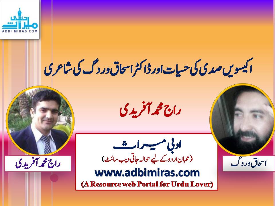 اکیسویں صدی جہاں ٹیکنالوجی کی صدی ہے،اردو ادب میں یہ بھی غزل ہی کی صدی ہے۔مختلف نظموں پر تجربات کے باوجود غزل کی بادشاہت و مقبولیت میں کوئی فرق نہیں آیا۔آج بھی غزل سے محبت کرنے والوں کی ایک بڑی تعدادموجود ہے۔جس طرح کے تجربات نظموں میں ہوئے،اسی طرح غزل میں بھی موضوعات کے لحاظ کافی تجربے ہوئے۔ یہی تجربات و نئے موضوعات تو اسحاق وردگ کو نئی پہچان دے گئے ہیں۔ اسی بنا پر موصوف کو طبقہ اہل ادب میں ”اکیسویں صدی کا شاعر“ کے نام سے جانا جاتا ہے۔اس حوالے سے ممتاز نقاد ڈاکٹر طارق ہاشمی اپنی کتاب "شعریات خیبر عصری تناظر” میں لکھتے ہیں: