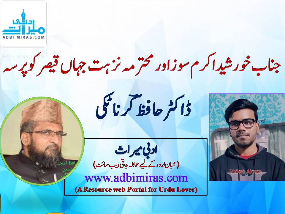 کیا خورشید اکرم سوز اور نزہت جہاں قیصر کے غموں اور دکھوں کے اٹھا سمندر کا ہم اندازہ کر سکتے ہیں؟ نہیں کرسکتے ہیں۔ ہم تو بس ان کے لیے صرف دعائیں کرسکتے ہیں کہ اللہ ان کے غموں کو راحت میں بدلنے کی کوئی سبیل نکال دے۔ ان شگاف جگر کومرہم فراہم کردے۔ ان کے دکھوں کے اندھیرے میں ڈوبے دلوں میں امیداور حوصلے کا چراغ روشن کردے۔ انہیں اپنی بہترین نعمتوں میں سے ساری نعمتیں عطاکردے۔ باالخصوص صبر کی نعمت سے انہیں نوازدے۔ تاکہ وہ اپنے لخت جگر شکیب اکرم کی جدائی کے غم کو برداشت کرسکیں۔ ہماری دعا ہے کہ اللہ مرحوم شکیب اکرم کے والدین، رشتے دار، بھائی بند، دوست احباب سب کو صبر جمیل عطاکرے۔ اور مرحوم کو اپنی رحمتوں کے سایہ میں اپنے پاس رکھے۔ ہم سبھی اس غم میں خورشید اکرم سوز، نزہت جہاں قیصر اور ان کے اپنوں کے غم میں برابر کے شریک ہیں۔ آپ کا شریکِ غم حافظ ؔ کرناٹکی