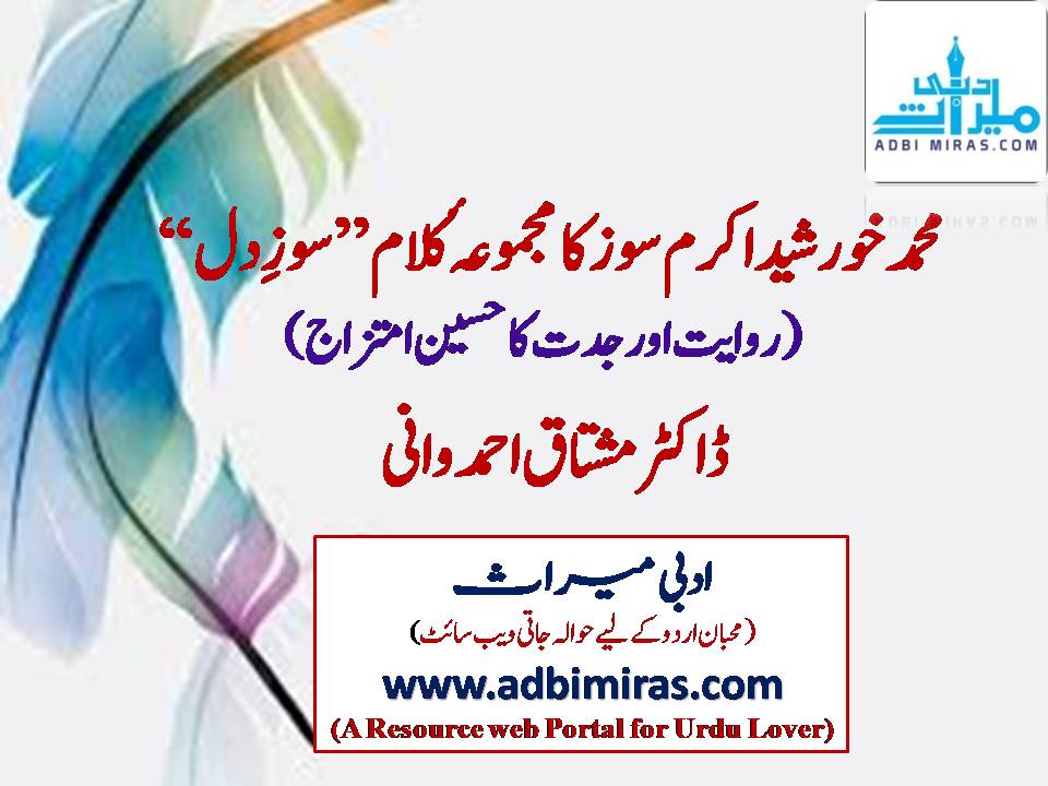 محمد خورشید اکرم سوز کا مجموعۂ کلام ’’سوز ِ دل‘‘ جو اردو اور ہندی دونوں رسم الخط میں شائع ہوا ہے کی کل تعداد صفحات 268 ہے۔ پورے مجموعۂ کلام کا مطالعہ کرنے کے بعد اس بات کا انکشاف ہوتا ہے کہ سوز ایک درد مند دل، وسیع النظر اور سیکولر جذبات واحساسات کے شاعر ہیں۔ علم عروض سے کماحقہ واقف ہیں۔ اس لیے شعر کہنے کا ہنر جانتے ہیں۔ ’’سوزِ دل‘‘ کا مطالعہ کرنے کے دوران مجھے اس بات کی بھی خوشی ہوئی کہ سوز نے اپنے پورے خاندان والوں، بیوی بچوں، دوست واحباب اور اپنے استاد محترم جناب مشیر جھنجھانوی کی تصویریں مذکورہ شعری مجموعے میں شامل فرماکر رشتوں کا نہ صرف احترام کیا ہے بلکہ ان کی اہمیت کا احساس بھی کروایا ہے۔ عصر حاضر میں جبکہ رشتوں کی پامالی اور بے قدری ہمارے سامنے ہے مجھے امید ہے اس مادیت پرستی کے دور میں خورشید اکرم سوز کا ’’سوزِ دل‘‘ پھر سے دلوں کو جوڑنے اور رشتوں کو سمجھنے کا ایک موثر وسیلہ ثابت ہوگا۔