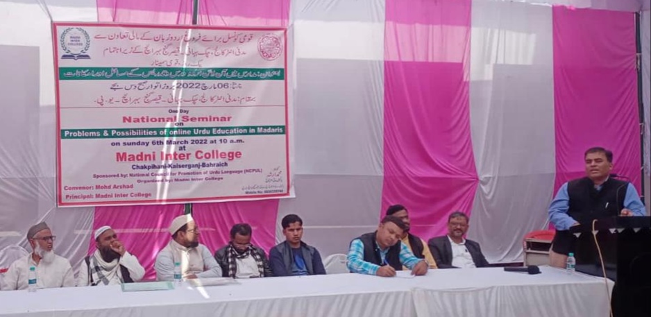 مدنی انٹرکالج چکپہانی ،بہرائچ۔۶مارچ ۲۰۲۲۔ مدارس ہندوستان میں تعلیمی نظام کا ایک اہم جز ہیں۔مالیاتی چیلینجز کے باوجود لاک ڈاون میں تعلیمی سلسلہ برقرار رکھنا اور جدید ٹکنالوجی سے تعلیم کے لئے استفادہ کرنا مدارس کا قابلِ فخر کارنامہ ہے۔ان خیالات کا اظہار ڈاکٹر شاہ محمد فائز نے مدنی انٹر کالج چکپہانی قیصر گنج بہرائچ کے زیر اہتمام ’مدارس میں آن لائن اردو درس وتدریس کے مسائل اور امکانات‘ کے موضوع پر قومی کونسل برائے فروغ اردو زبان کے اشتراک سے منعقد قومی سمینار میں افتتاحی اجلاس کے دوران کلیدی خطبہ میں کیا ۔کالج کے احاطے میں منعقد سمیناکے افتتاحی اجلاس کی صدارت مولانا حاجی رئیس قاسمی نے فرمائی۔مولانا صلاح الدین مظاہری بطور مہمان خصوصی شریک ہوئے ۔مولانا نور الدین قاسمی نے قرآن پاک کی تلاوت کی۔ڈاکٹر عمیر منظرنے نظامت کا فریضہ انجام دیا ۔اس سے قبل سیمنار کے کنوینر محمد ارشد رئیس نے مہمانوں کا خیر مقدم کیا۔