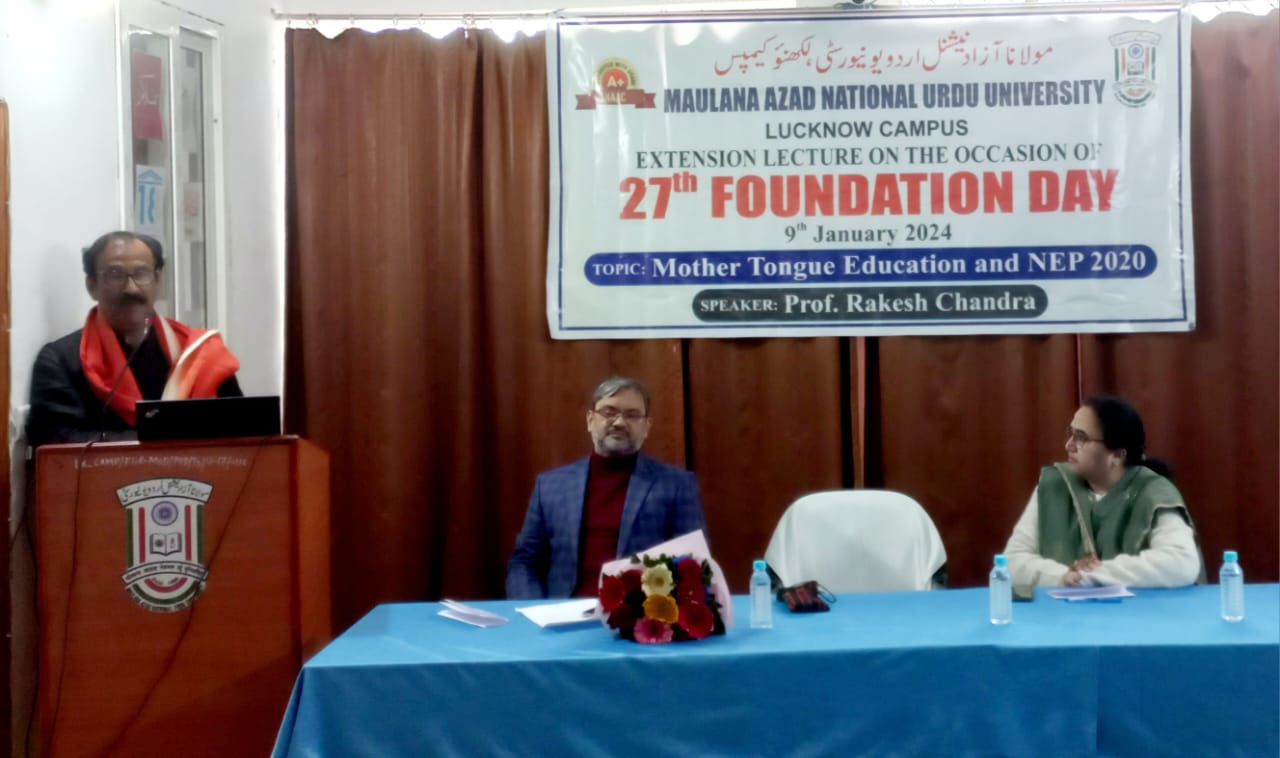 مادری زبان انسان کی بنیادی شناخت ہے ۔مادری زبان کے ذریعہ تعلیم سے قربت بڑھ جاتی ہے ۔ہندستان میں تعلیمی آزادی کو عام کرنے کا سہرا مولانا آزاد کے سر ہے ۔ان خیالات کا اظہار لکھنؤ یونی ورسٹی میں شعبہ فلسفہ کے سابق صدر پروفیسر راکیش چندرانے مولانا آزاد نیشنل اردو یونی ورسٹی کے یوم تاسیس کے موقع پر لکھنؤ کیمپس میں منعقد ایک توسیعی خطبہ کے دوران کیا ۔وہ مادری زبان میں تعلیم اور قومی تعلیمی پالیسی ۲۰۲۰کے موضوع پر توسیعی خطبہ پیش کررہے تھے ۔ابتدا میں کیمپس کی انچارج ڈاکٹر ہما یعقوب نے مہمان کی خدمت میں گلدستہ پیش کر کے خیر مقدم کیا ۔ڈاکٹر انور الحق نے قرآن پاک کی تلاوت کی ۔ ڈاکٹر عمیر منظر نے نظامت کا فریضہ انجام دیا ۔واضح رہے کہ لیکچر سے پہلے تمام اساتذہ ’ریسرچ اسکالر اور غیر تدریسی عملہ نے ہیڈ کوارٹر میں جاری یوم تاسیس کی تقریبات کو براہ راست دیکھنے کابھی اہتمام کیا ۔