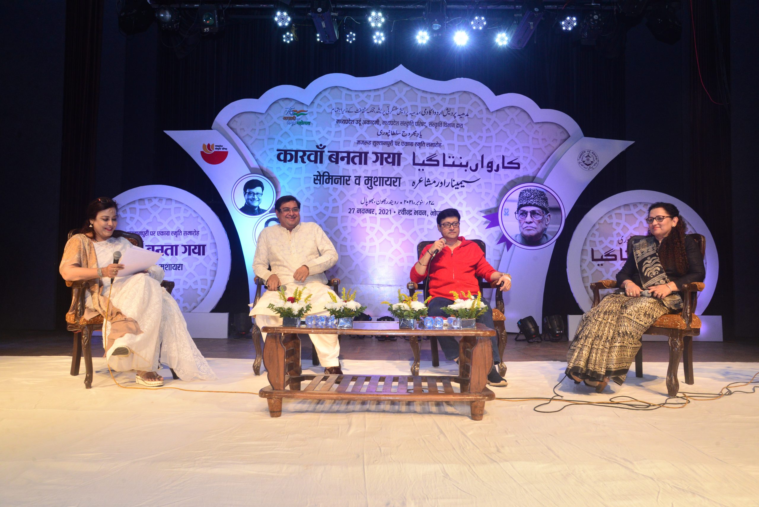 دھیہ پردیش اردو اکادمی،مدھیہ پردیش سنسکرتی پریشد، محکمہ ثقافت کے زیر اہتمام یادِ مجروح سلطانپوری کے تحت ”کارواں بنتا گیا“ موضوع پر سیمینار اور مشاعرہ کا انعقاد 27 نومبر، 2021 کو دوپہر 3:00 بجے سے رویندر بھون، بھوپال میں معروف فلم اداکار، ہدایت کار اور فلم ساز سچن پِلگاؤں کر اور رومی جعفری -ممبئی کی باوقار موجود گی میں کیا گیا.