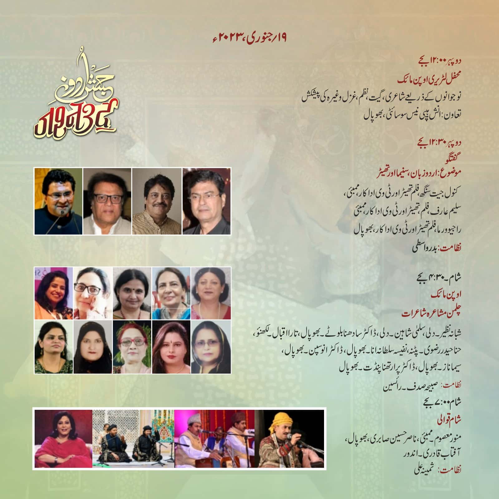 مدھیہ پردیش اردو اکادمی ،سنسکرتی پریشد ،محکمہ ثقافت کے زیر اہتمام آزادی کا امرت مہوتسو کے تحت سہ روزہ *جشن اردو* محترمہ اوشا ٹھاکر، وزیر، محکمہ ثقافت، سیاحت و روحانیت کی بطور مہمان خصوصی موجودگی میں 18، 19، 20 جنوری کو روزانہ صبح 12 بجے سے رات 10 بجے تک *گوہر محل، وی آئی پی روڈ بھوپال* میں منعقد ہوگا.