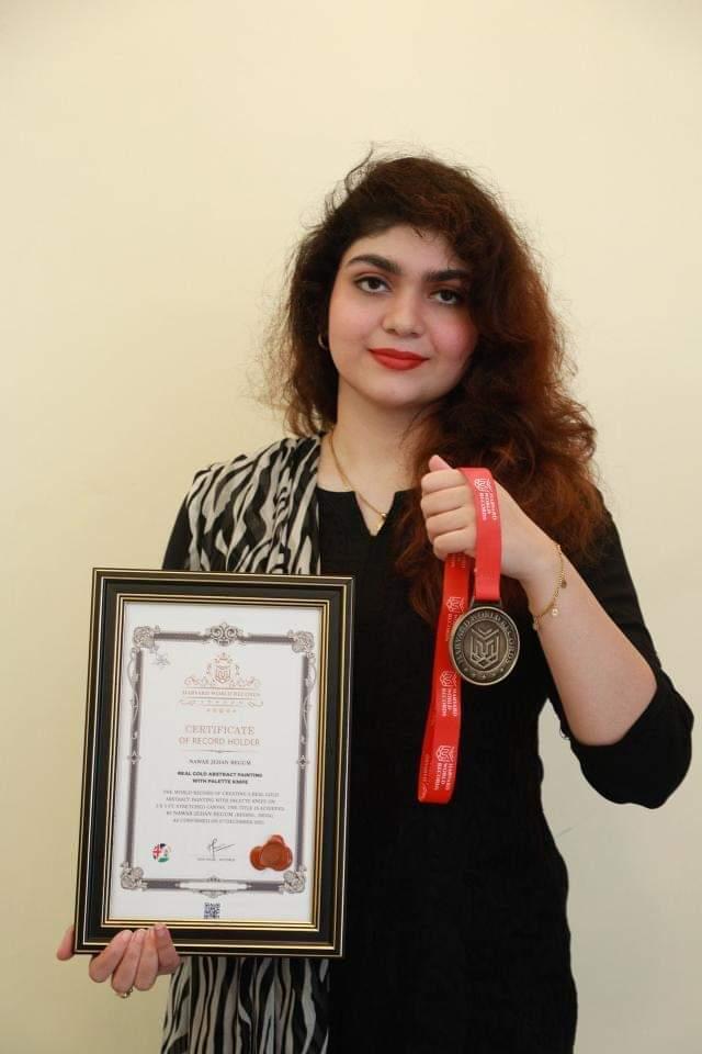 رضوان الدین فاروقیبھوپال سے تعلق رکھنے والی نوجوان مصور اور خطاط نواب جہاں بیگم کو ہاورڈ ورلڈ ریکارڈ، لندن نے "ریئل گولڈ ایبسٹریکٹ پینٹنگ وتھ پیلیٹ نائف” کے عالمی ریکارڈ سے سرفراز فرمایا ہے. نواب جہاں نے یہ ورلڈ ریکارڈ ایک خاص طرح کی پینٹنگ بنا کر اپنے نام کیا ہے، جس میں انھوں نے صرف پیلٹ چاقو کا استعمال کرتے ہوئے بہت بڑی "ریئل گولڈ ایبسٹریکٹ آرٹ پینٹنگ” بنائی ہے. اس پینٹنگ کے کام میں نظر آنے والا سونا اصلی نظر آتا ہے.