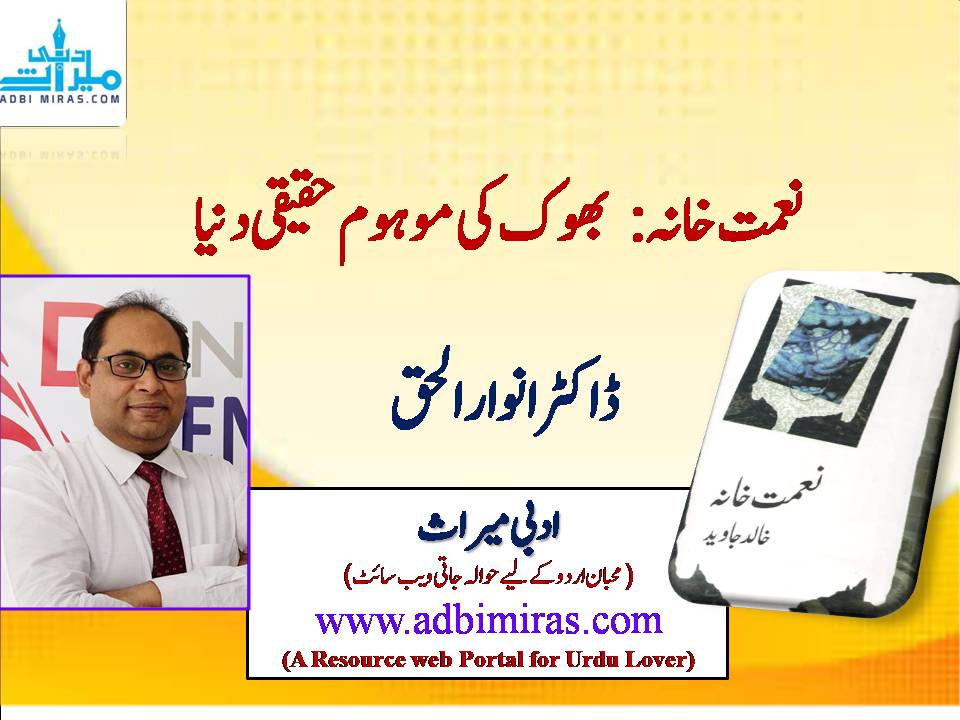 ناول’ نعمت خانہ ‘کا موضوع بھوک ہے۔اس کیفیت سے گذرتے ہوئے انسان جرم کے سمندر میں بھی غوطے لگاتا ہے اور موت کے گھاٹ اتر جاتا ہے، اور اتار بھی دیتا ہے۔ اسلوب ایسا اختیار کیا گیا ہے کہ الفاظ تشبیہات کی مدد سے کہانی کو آگے بڑھاتے ہیں۔ علامتوں کا استعمال بالکل نہیں ہے، در اصل علامتیں موت کی کتاب کے پہلے حصے میں بھی نہیں تھیں، وہ تو در اصل اردو کے کچھ نام نہاد ناقدین نے نا سمجھی کی بنیاد پر موت کی کتاب کو علامتی ناول کہہ ڈالا تھا، حالانکہ دلیل کچھ بھی نہ تھی۔ ناول نعمت خانہ میں تہہ در تہہ چل رہی کہانی کو ہم پڑھ کر محظوظ ہو تے ہیں۔ ’چبا چبا کر پڑھی جانے والی کتاب ہے‘ ناول نعمت خانہ کی خصوصیت یہ ہے کہ اس میں حقیقت کے اظہار کے لیے جادوئی حقیقت نگاری اور موہوم حقیقت نگاری کا سہارا لیا گیا ہے۔ عرض کرتا چلوں کہ جادوئی حقیقت نگاری یا موہوم حقیقت نگاری کسی تحریک یا تکنیک کا نام نہیں یہ وہ زاویے ہیں جن کی مدد سے فن پاروں میں موجود فنی کاریگری کو سمجھنے میں مدد ملتی ہے۔ جدیدیت کے زیرِ اثر وجود میں آنے والے بیشتر فکشن کی طرح اس ناول نعمت خانہ میں ترسیل کا مسئلہ بالکل نہیں ہے۔ ایک ادنیٰ سا قاری بھی اس ناول میں الفاظ کے نہاں خانوں میں پوشیدہ جذبات، کیفیات، محسوسات ، اور پیغامات تک رسائی حاصل کر سکتا ہے۔