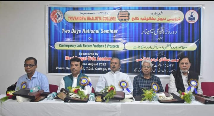 رانی گنج : مغربی بنگال اردو اکیڈمی کے اشتراک سے شعبہء اردو رانی گنج کا دو روزہ قومی سیمینار 24اور25اگست کو کالج کے سیمینار ہال میں بعنوان”معاصر اردو فکشن ،مسائل اور امکانات "منعقد ہوا جس کے افتتاحی اجلاس کی صدارت مولانا مظہر الحق یونیورسٹی ،بہار کے سابق پرو وائس چانسلر پروفیسر توقیر عالم نے کی جبکہ کلیدی خطبہ جواہر لال نہرو یونیورسٹی نئی دہلی کے ممتاز پروفیسر اور ناقد جناب سید محمد انور عالم پاشا نے دیا مہمان خصوصی اور مہمان اعزازی بالترتیب علی گڑھ مسلم یونیورسٹی کے شعبۂ اردو کے پروفیسر اور مشہور و معروف فکشن ناقد جناب صغیر افراہیم اور جناب شہاب الدین ثاقب تھےاس اجلاس میں خیر مقدمی کلمات شعبۂ اردو کی استانی ڈاکٹر مہ جبین نے ادا کیے جبکہ نظامت کے فرائض ڈاکٹر محمد شمشیر عالم نے بحسن و خوبی انجام دیا اورہدیۂ تشکر ڈاکٹر صابرہ خاتون حنا نے پیش کیااس افتتاحی اجلاس میں شعبہ اردو کی جانب سے مہمانوں کو گلدستہ،میمنٹو،فائل اور شال کا نذرانہ پیش کیا گیا