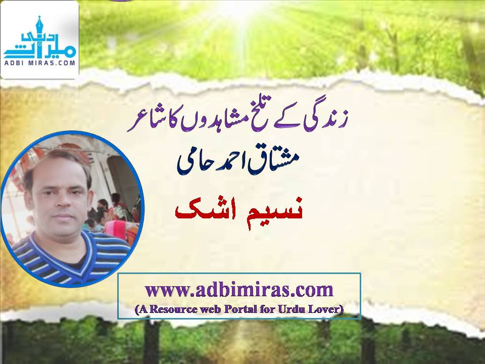 مشتاق احمد حامی صحافی،شاعر،مرتب ،ادیب اور مبصر ہیں ان کی کئی کتابیں منظر عام پر کر داد و تحسین وصول کر چکی ہیں۔تیس سالوں تک اردو روز نامہ اخبار مشرق سے وابستہ رہیں اور معتدد کتابوں پر ان کے تبصرے بھی شائع ہوئے۔ اردو زبان و ادب سے گہری عقیدت و محبت رکھتے ہیں اور اس بات کی ترجمانی انکی تصانیف کرتی ہیں۔”زرد ہواؤں سے” ان کا شعری مجموعہ ہےجو 2010 میں شائع ہوا۔اپنے احساسات کی ترسیل کے لئے انہوں نے نظم اور غزل دونوں کو چنا۔غزل کا جادو ایسا جادو ہے جس کی اثر سے بچنا ممکن نہیں۔ولیم ورڈس ورتھ نے لندن شہر کی خوبصورتی کے لئے جو فقرہ استعمال کیا تھا میں وہی فقرہ غزل کے حسن کے لئے استعمال کر رہا ہوں”Dull would he be of soul who could pass by”۔غزل اردو ادب کی شان ہے۔بدلتے حالات کے موافق جس نے خود کو ڈھالا وہ غزل ہی ہے جس کے موضوعات وقت کے ساتھ بدلتے گئے اوروسیع سے وسیع تر ہوتے گئے۔اس نے ہمیشہ بدلتے وقت کے ساتھ کندھے سے کندھے ملا کر چلی اور شاید اس لئےآج تک اس کا جادو سر چڑھ کر بول رہا ہے۔