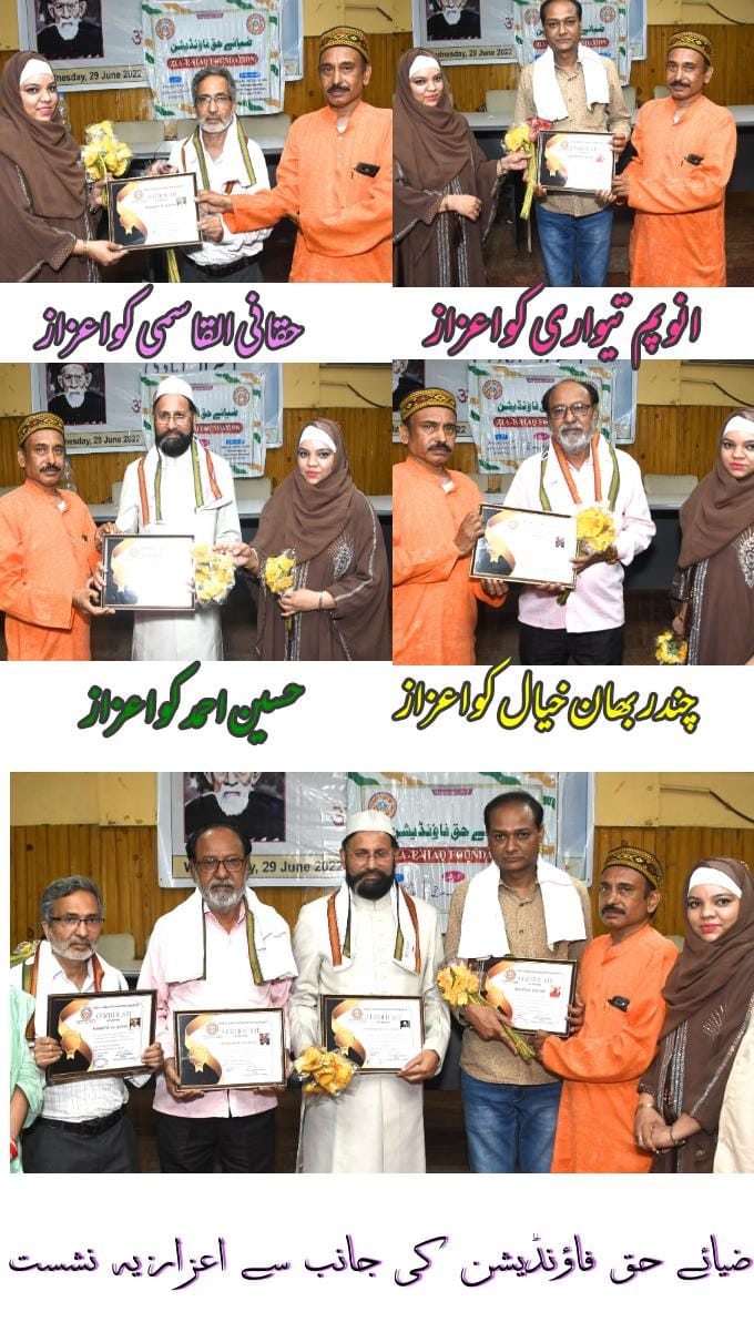 ساہتیہ اکادمی نئی دہلی کی جانب سے اکبر الٰہ آبادی کی 175ویں یوم پیدائش کے موقع پر الٰہ آباد میوزیم ہال میں سیمینار ، مشاعرہ اور کتاب کی رسم اجرأ کا پروگرام منعقد کیا گیا۔اس تاریخی موقع پر اردو ہندی شعر و ادب کے چار ممتاز شخصیات اردوکے معروف شاعر وساہتیہ اکادمی ایوارڈ یافتہ چندربھان خیال ، اردو کے ممتاز ادیب ،و صحافی محقق ،نقاد ،مترجم ،وساہتیہ اکادمی ایوارڈ یافتہ حقانی القاسمی ،صدر شعبۂ اردو ویرکنور یونیورسٹی آرہ ،ممبر ساہتیہ اکادمی،درگاہ شاہ ارزانی کے سجادہ نشیں پروفیسر حسین احمد،ممتازہندی شاعرایڈیٹر ہندی ساہتیہ اکادمی نئی دہلی اور یوا ساہتیہ اکادمی ایوارڈ یافتہ محترم انوپم تیواری کو ضیائے حق فاؤنڈیشن (الٰہ آباد ) کی جانب سے ان کی علمی و ادبی خدمات کے اعتراف میں اعزاز سے نوازا گیا ۔اس موقع پر چندربھان خیال صاحب نے ضیائے حق فاؤنڈیشن کی تعریف کرتے ہوئے کہا’’ضیائے حق فاؤنڈیشن ایک ایسی تنظیم ہے جس نے بہت کم وقتوں میں اہل علم وفن کی توجہ اپنی جانب مر کوز و مبذول کرانے میں کامیاب رہی ،اس فاؤنڈیشن کی سب سے بڑی خاصیت یہ ہے کہ یہ ملک بھر کے ایسے شعرأ و ادبأکو تلاش کرتی ہے جنہیں دنیائے ادب فراموش کر چکی ہے یہ فاؤنڈیشن ان قلمکاروں کا تعارف کراکر ان کی بھر پور حوصلہ افزائی کرتی ہے۔ ساتھ ہی نوجوان قلمکاروں کو بھی پلیٹ فارم مہیا کراکر ان کی حوصلہ افزائی کرتی ہے جو قابل تعریف ہے ،ضیائے حق فاؤنڈیشن کی جانب سے دیے گئے اس اعزاز پر میں ڈاکٹر صالحہ صدیقی کا شکریہ ادا کرتا ہوں اور یہ دعا کرتا ہوں کہ یہ کارواں یونہی رواں دواں رہے ۔‘‘